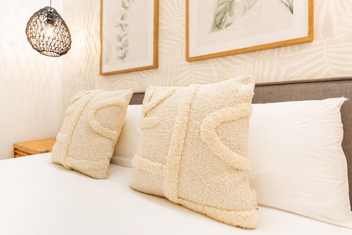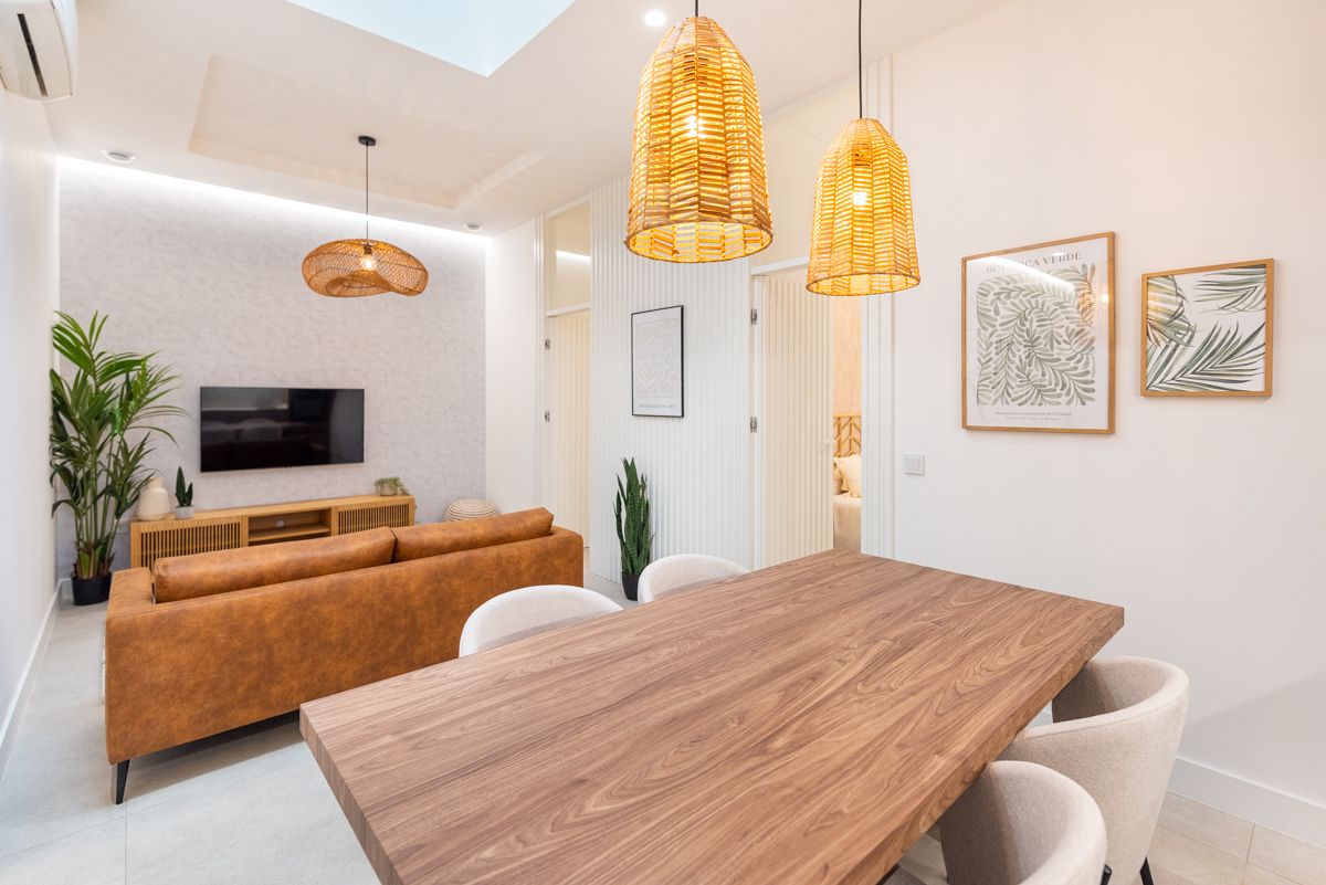 En este bonito apartamento se puede ver una sofisticada fusión de Japandi y diseño contemporáneo con acentos boho-cálidos. La base del diseño es claramente Japandi, una mezcla entre la simplicidad funcional escandinava y la elegancia rústica japonesa. Esto se manifiesta en la paleta de colores neutros, donde predominan los blancos y beiges, creando un lienzo luminoso y sereno que se ve enriquecido con la calidez de la madera en tonos naturales y medios, presente en el mobiliario, la mesa de comedor y los armarios de la cocina.