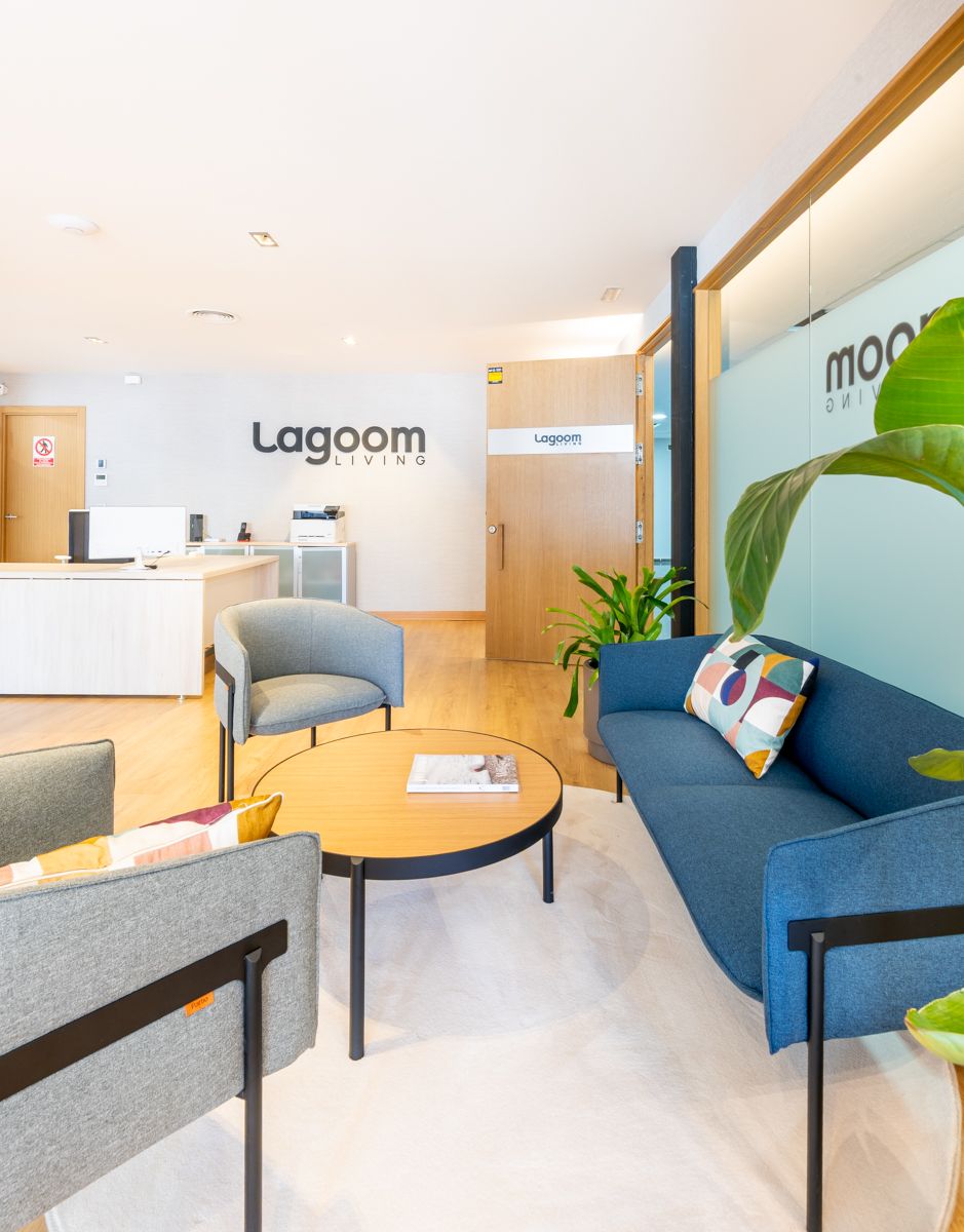 La sala de reuniones sigue la misma línea estética con una gran mesa de madera y sillas ergonómicas en azul, manteniendo la coherencia cromática y funcional. La presencia de elementos de branding de «Lagoom Living» integrados en la decoración refuerza la imagen de marca de la empresa. En conjunto, el estilo es una mezcla de minimalismo práctico y confort moderno, ideal para un entorno de trabajo productivo y agradable.