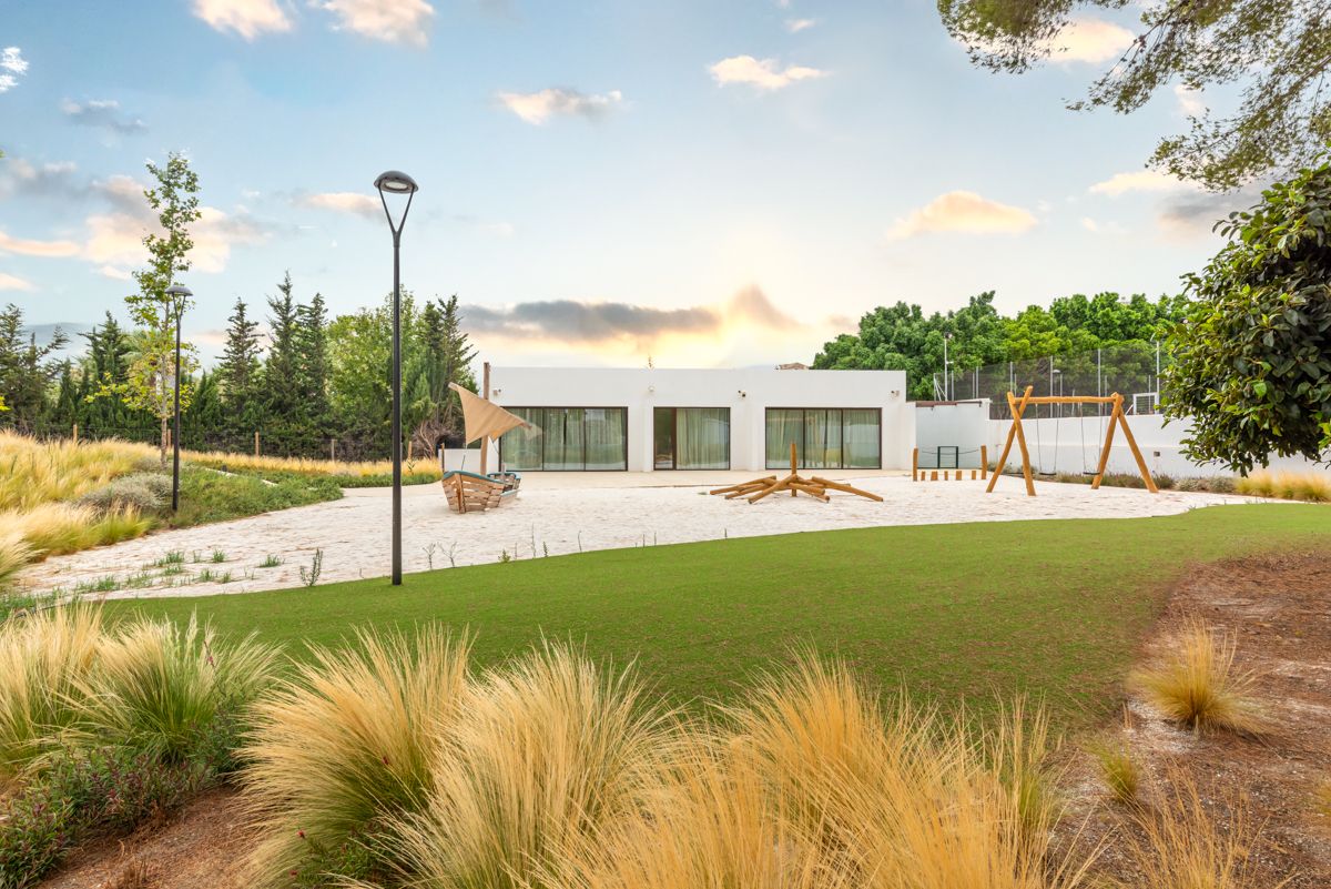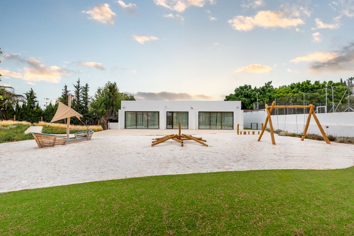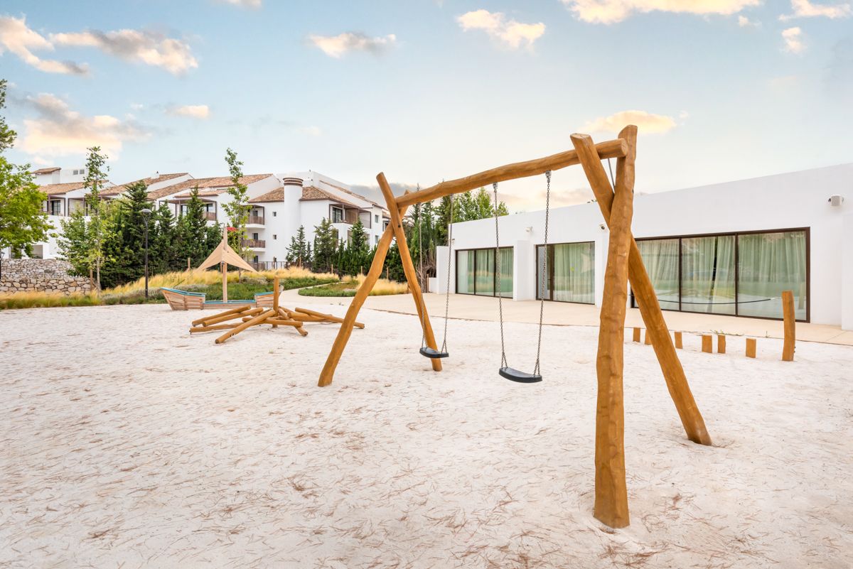 El mobiliario, a menudo diseñado a medida, se combina con piezas de fibras naturales como el esparto y el lino. La cerámica artesanal y la piedra natural están presentes en fuentes y revestimientos, reforzando el vínculo con la tierra. Las zonas comunes fluyen orgánicamente hacia el exterior, integrando el paisaje del campo de golf y las montañas de Mijas mediante grandes ventanales y terrazas escalonadas.