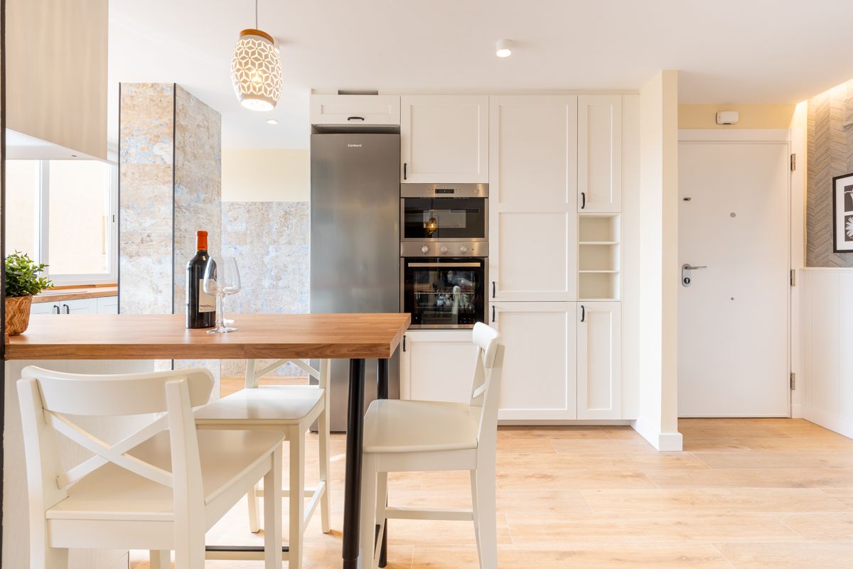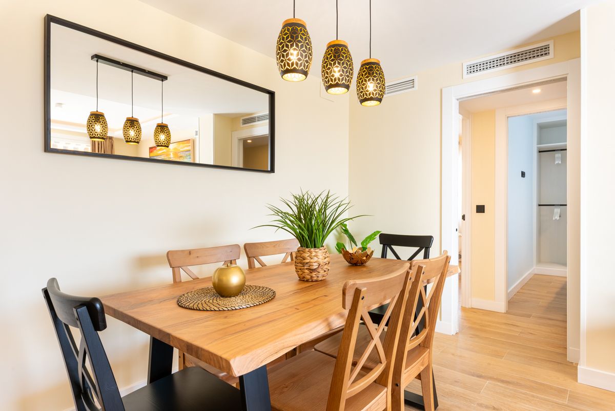 La iluminación, con lámparas colgantes de diseño que mezclan metal y materiales naturales, junto con la abundante luz que entra por el balcón, completan un ambiente que se siente vivido, alegre y cuidadosamente diseñado para el confort, logrando un equilibrio perfecto entre lo tradicional y lo moderno.
