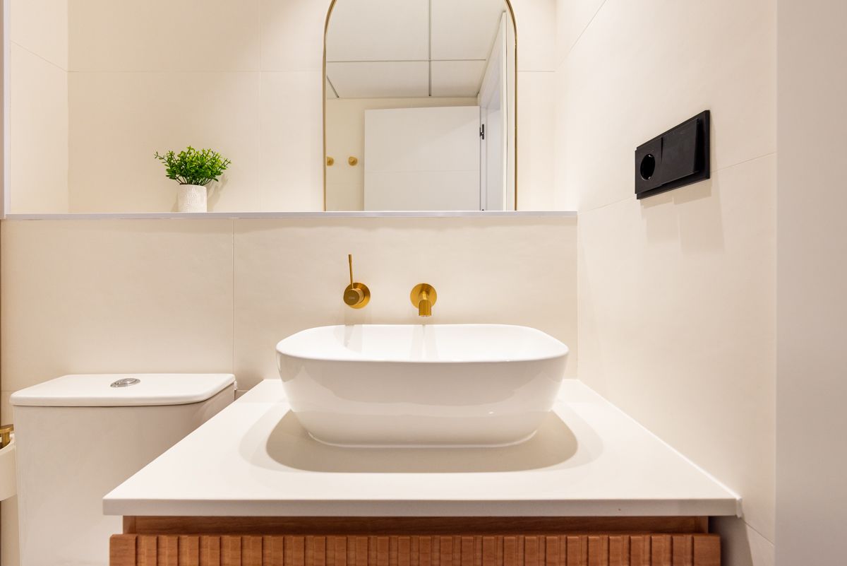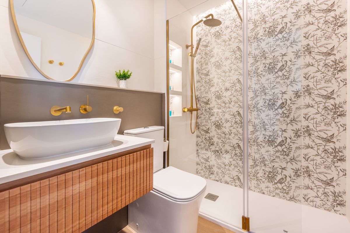 El baño rompe con la serenidad para hacer una declaración de estilo audaz y contemporánea. La pared de la ducha, revestida con un llamativo papel pintado floral de gran formato, crea un efecto espectacular y artístico. Este atrevimiento se equilibra con la elegancia de la grifería y perfilería en tonos dorados o latón, y el moderno mueble de madera acanalada, demostrando una cuidada atención a las tendencias actuales.