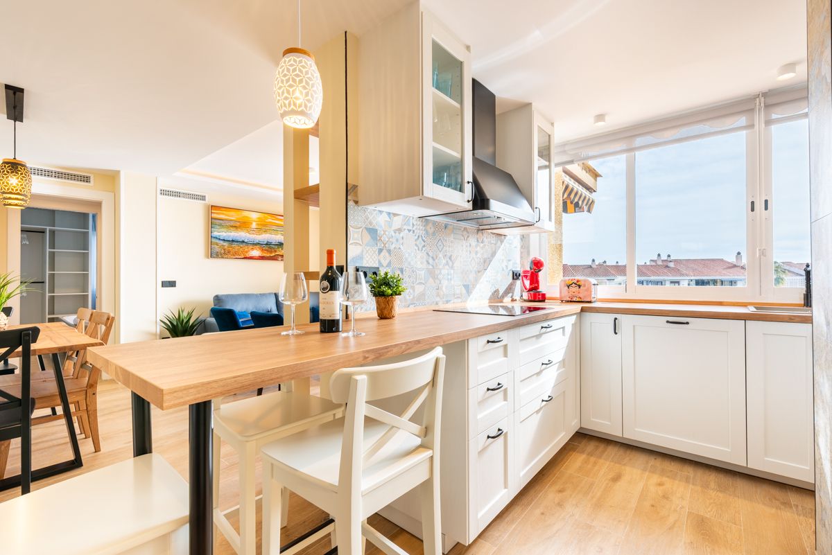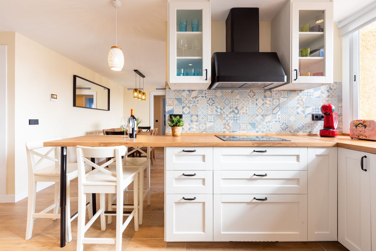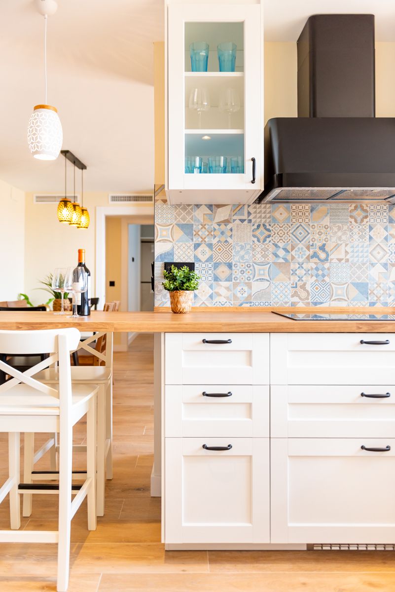 Sobre esta base se superponen claros acentos mediterráneos. El más evidente es el vibrante salpicadero de azulejos con patrones geométricos en tonos azules y blancos en la cocina, un elemento que evoca las costas de Grecia o Italia y se convierte en un punto focal lleno de encanto. Este uso audaz del color se repite en el salón con los sillones de terciopelo azul intenso, que añaden un toque de sofisticación.
