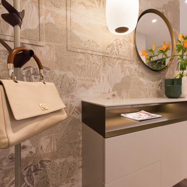 La zona de día se articula sobre una paleta de colores neutros y terrosos, donde las paredes con un sutil papel texturizado en tono arena crean un lienzo acogedor. El mobiliario modular del salón es una pieza clave, combinando frentes lisos en beige con secciones acanaladas en madera de nogal, un detalle de tendencia que aporta ritmo y sofisticación. La alfombra de motivos geométricos en tonos verdes y grises delimita el espacio y añade un toque de dinamismo cromático, que se replica en los cojines. La iluminación se trata como un elemento escultórico, destacando la lámpara de pie dorada y la gran lámpara de suspensión plisada sobre el comedor, que genera una luz suave y difusa.
