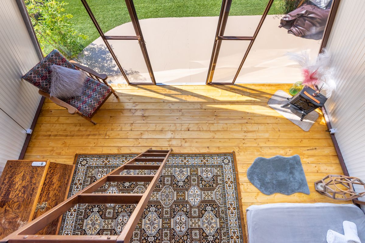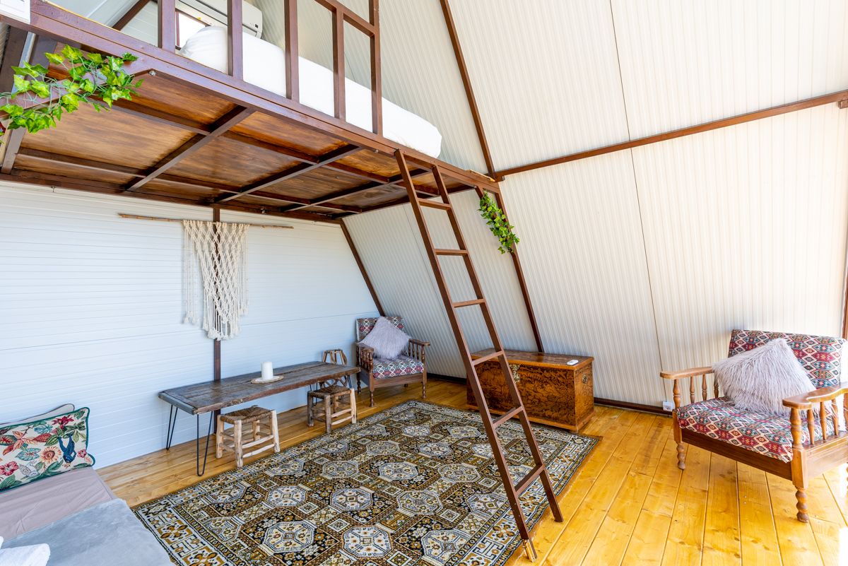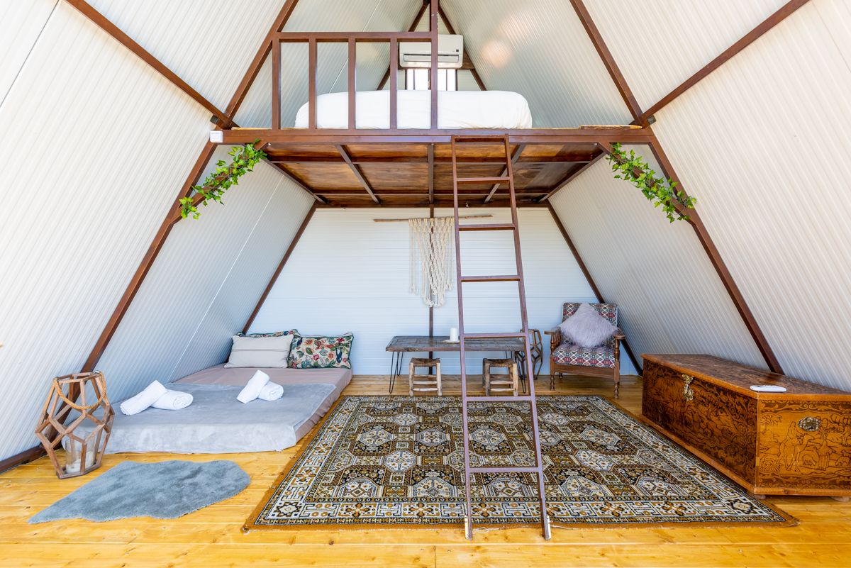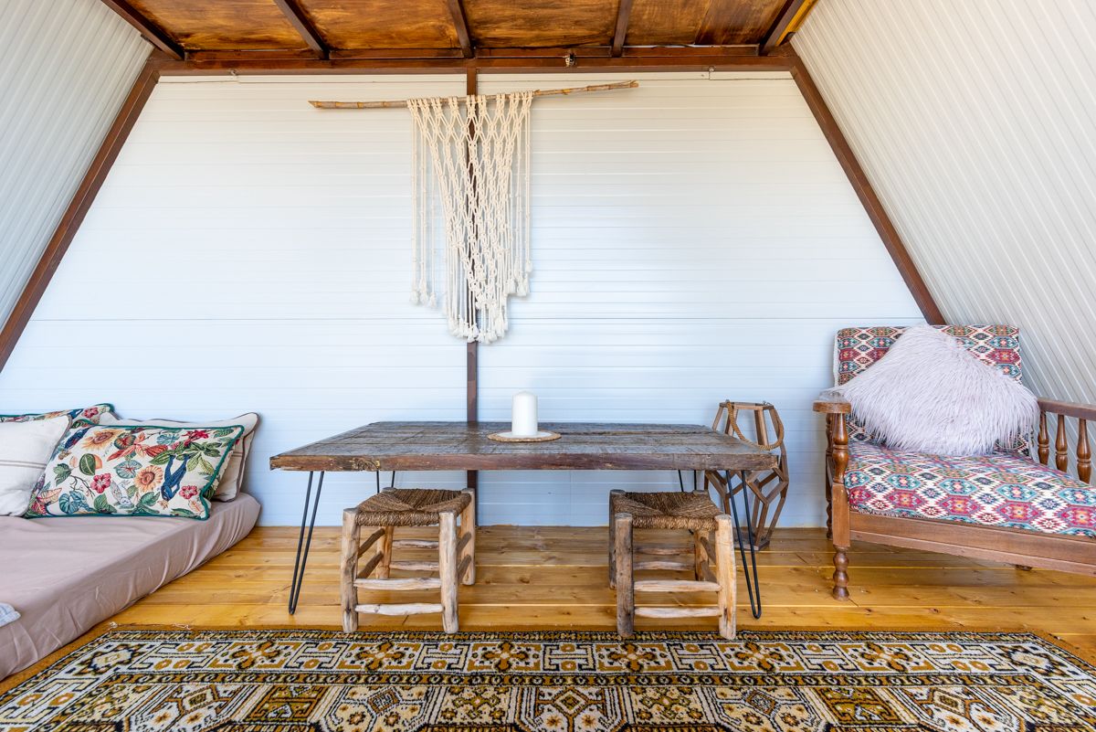 El interior de la cabaña triangular adopta un estilo rústico-bohemio. Se observan suelos de madera clara que aportan calidez, combinados con una alfombra de estilo persa que introduce patrones y colores vibrantes. Elementos decorativos como el macramé, cojines estampados y muebles de madera robusta (como el baúl tallado y la mesa de trabajo) refuerzan la estética bohemia. La funcionalidad está presente con una cama en la planta principal y otra en un altillo accesible por una escalera de mano, optimizando el espacio vertical característico de las A-frame.