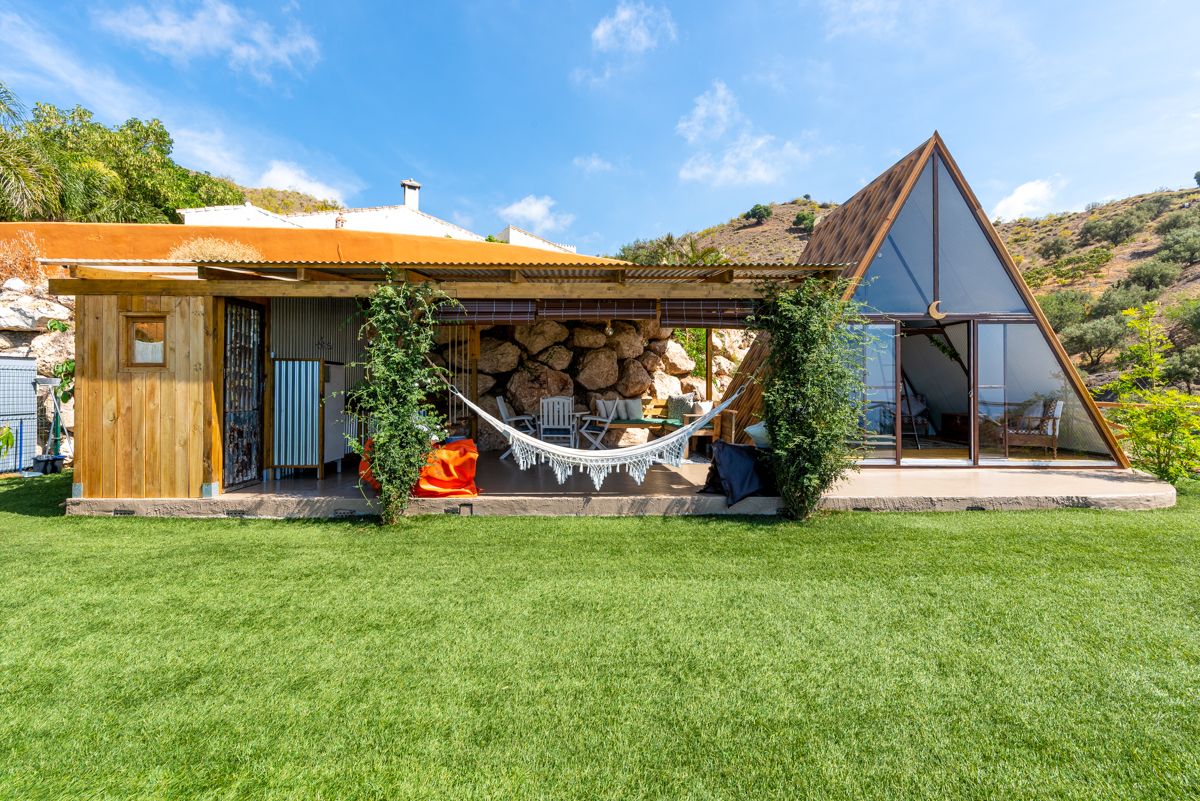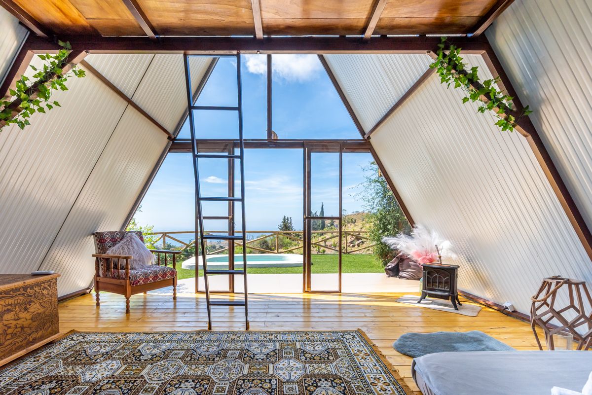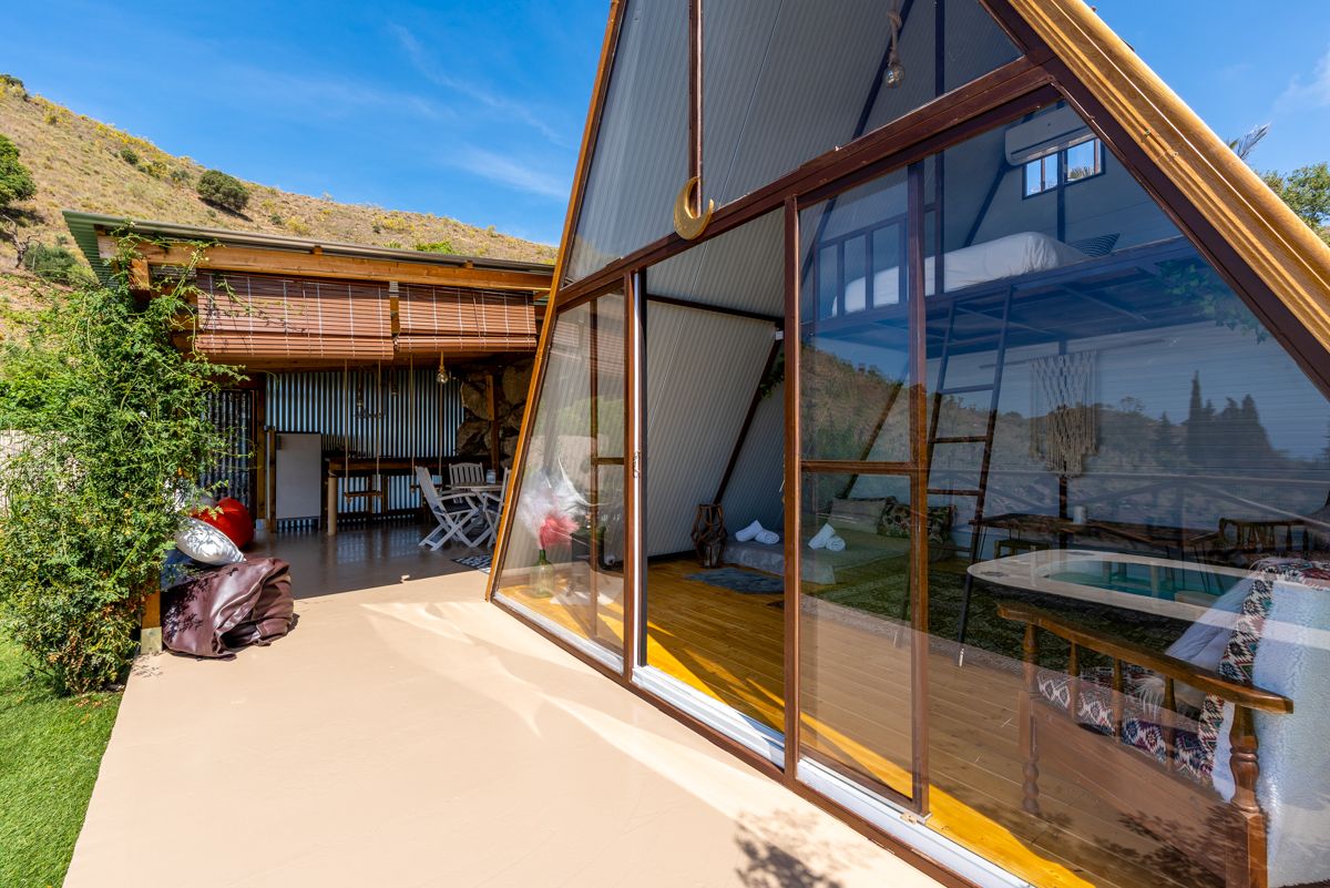 El estilo de esta propiedad es una fusión fascinante de arquitectura rústica-bohemia con un diseño de cabaña en forma de A o «A-frame», perfectamente integrado en un entorno natural y escarpado. La estructura principal, con su icónica forma triangular y paredes de cristal, maximiza la entrada de luz natural y ofrece vistas panorámicas al paisaje montañoso y, posiblemente, al mar a lo lejos. Esta tipología arquitectónica remite a la simplicidad y la conexión con la naturaleza, a menudo asociada con retiros y escapadas.