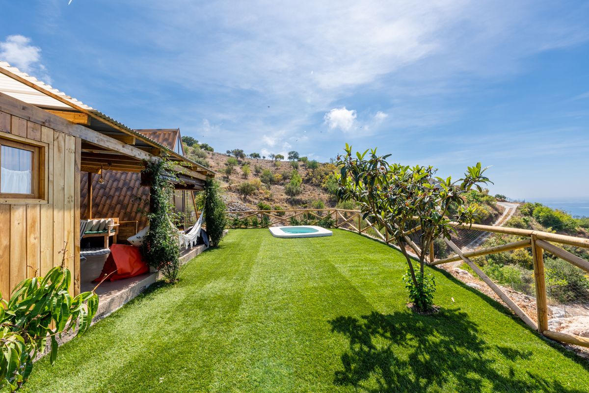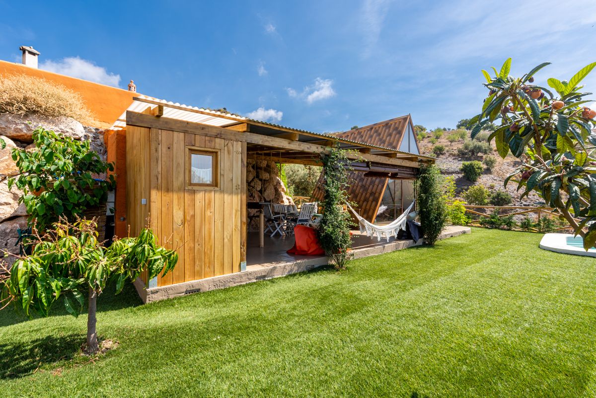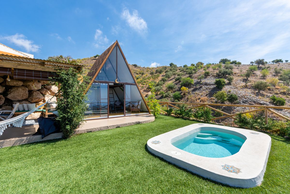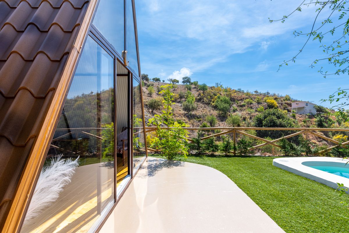 El estilo de esta propiedad es una fusión fascinante de arquitectura rústica-bohemia con un diseño de cabaña en forma de A o «A-frame», perfectamente integrado en un entorno natural y escarpado. La estructura principal, con su icónica forma triangular y paredes de cristal, maximiza la entrada de luz natural y ofrece vistas panorámicas al paisaje montañoso y, posiblemente, al mar a lo lejos. Esta tipología arquitectónica remite a la simplicidad y la conexión con la naturaleza, a menudo asociada con retiros y escapadas.