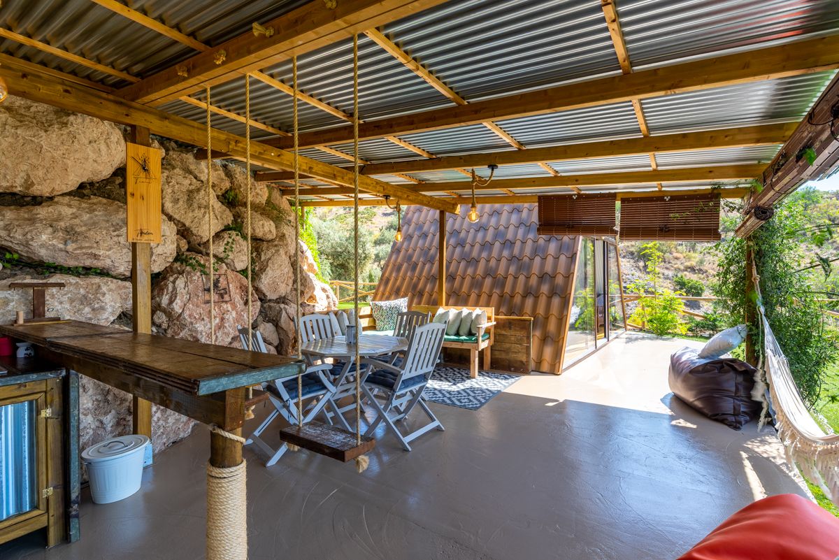 El entorno exterior complementa el diseño de la casa. El terreno aterrazado, las paredes de piedra expuesta y la vegetación mediterránea, como olivos y arbustos, crean un ambiente auténtico y arraigado en la topografía. La zona de porche, con su techo de chapa y vigas de madera, así como una hamaca, invita a la relajación al aire libre. La pequeña piscina o jacuzzi con detalles de azulejos artesanales añade un toque de encanto y lujo discreto. La combinación de materiales naturales como la madera, la piedra y la chapa ondulada subraya un enfoque sostenible y orgánico, donde la edificación dialoga armoniosamente con el paisaje. Es un diseño que celebra la vida al aire libre y la desconexión, con un aire artesanal y relajado.