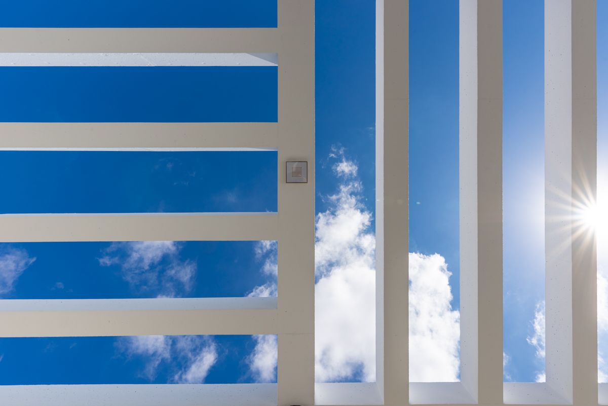 Un elemento arquitectónico clave y recurrente son las pérgolas de vigas rectas, tanto en los áticos como en las zonas comunes. Estas estructuras no solo cumplen una función práctica al proporcionar sombra y crear espacios de transición entre el interior y el exterior, sino que también añaden un fuerte componente estético, generando un interesante juego de luces y sombras que cambia a lo largo del día y rompe la solidez de los volúmenes. Las amplias terrazas y los grandes ventanales son otra característica fundamental, evidenciando un diseño enfocado en el estilo de vida al aire libre y en la conexión visual con el entorno.