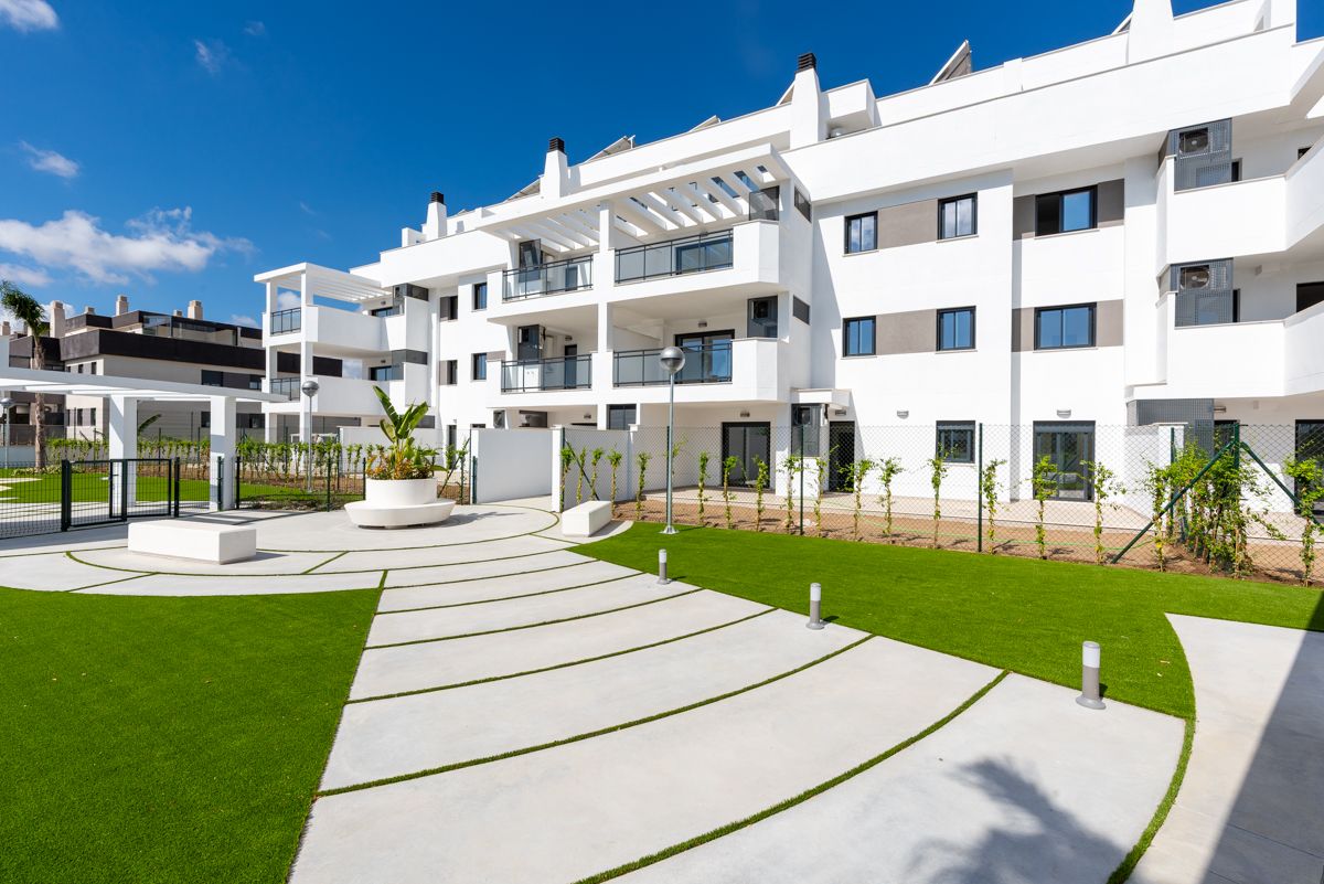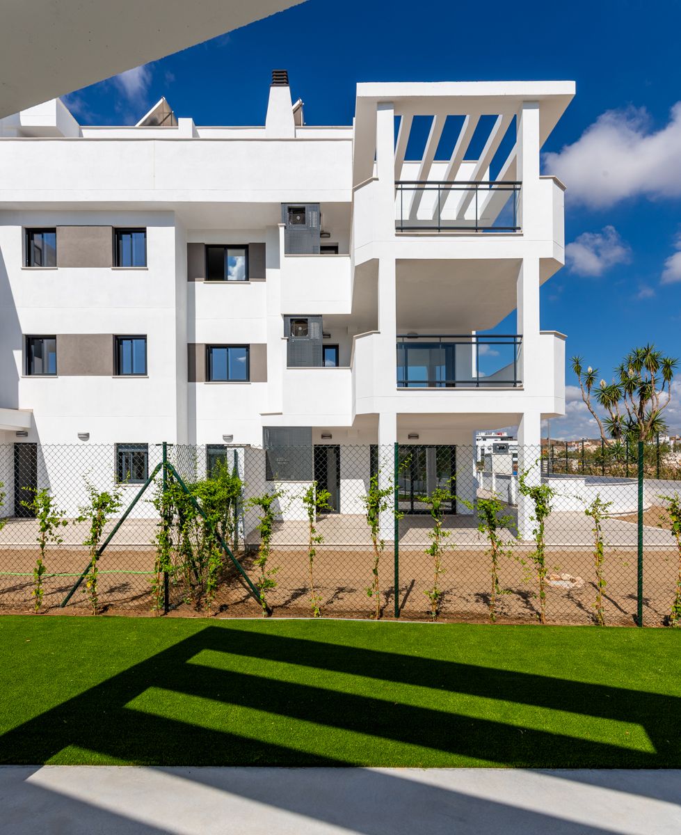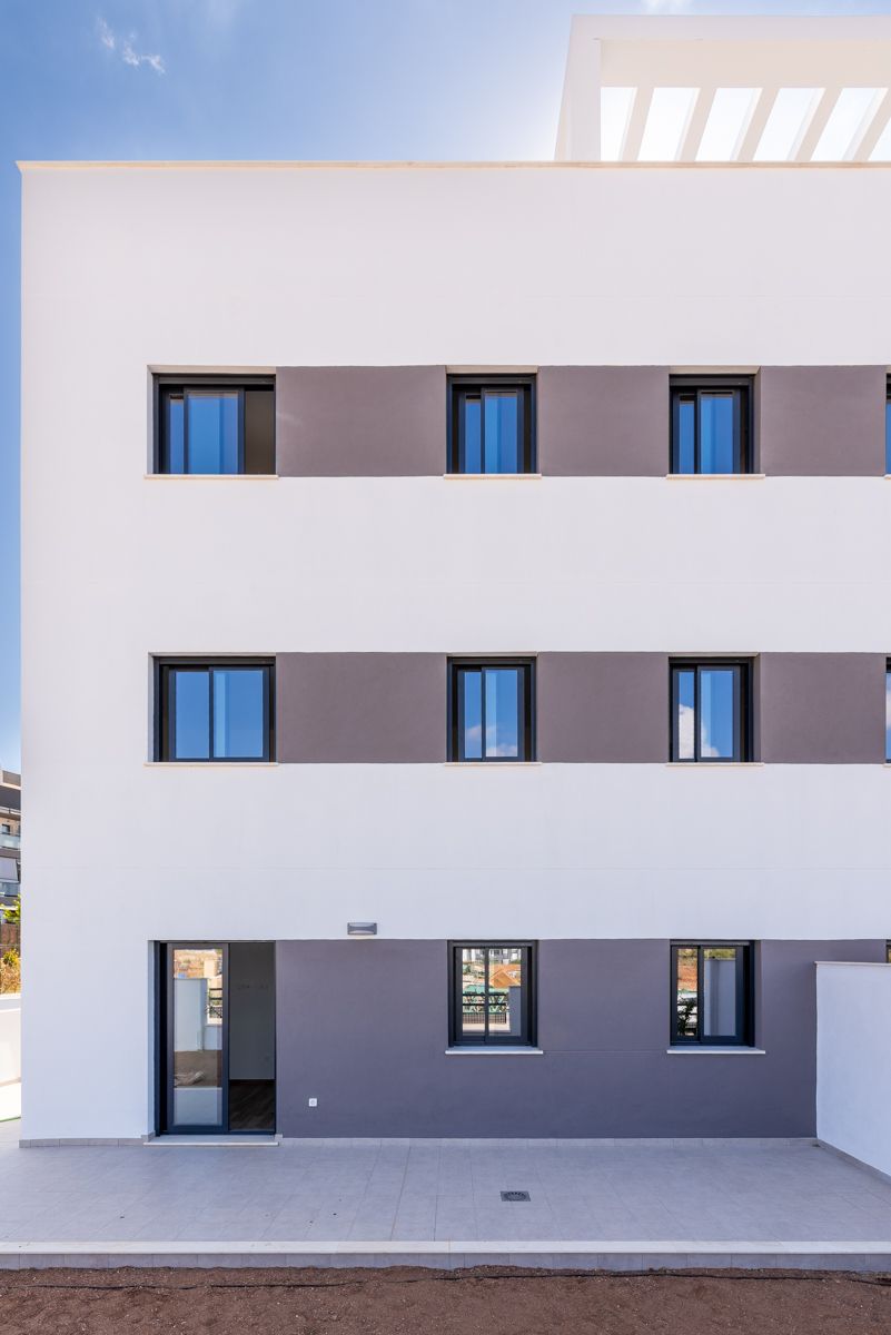 El conjunto residencial es un claro exponente de la arquitectura contemporánea de inspiración mediterránea. El diseño se basa en una composición de volúmenes geométricos puros y líneas rectas, donde predomina el color blanco, un recurso clásico en la arquitectura de climas soleados para reflejar el calor y potenciar la luminosidad. Este lienzo monocromático se contrasta de forma elegante con la carpintería de ventanas y barandillas en tonos oscuros, como el gris antracita o el negro, lo que acentúa la profundidad y el ritmo de la fachada.