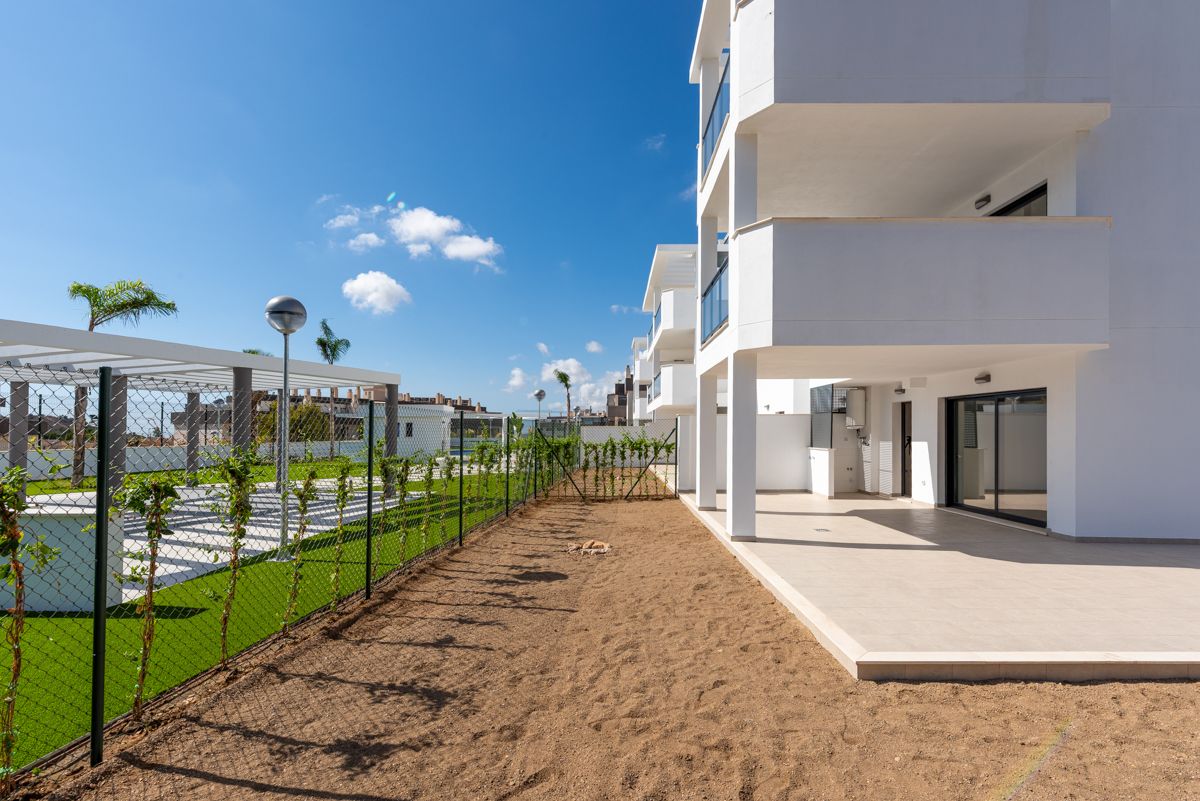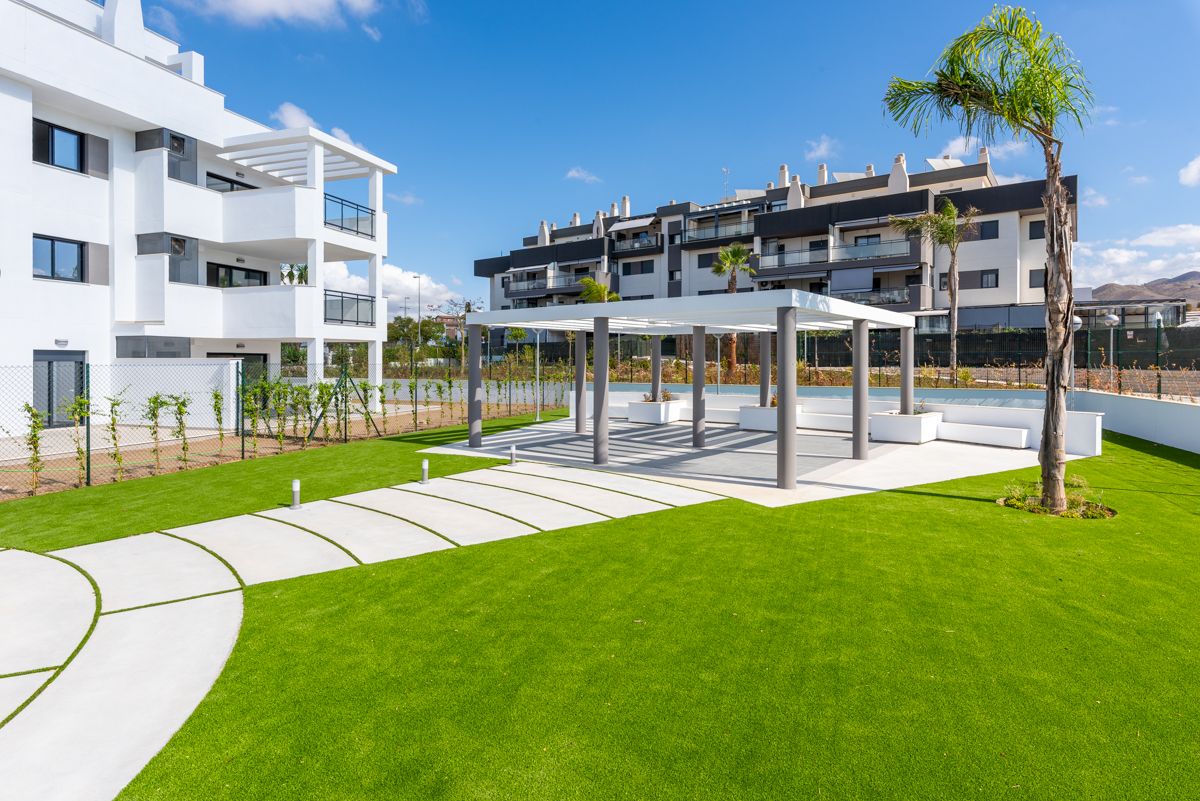 Desde el punto de vista del diseño paisajístico, se busca la funcionalidad y el bajo mantenimiento. Las zonas comunes se articulan en torno a una piscina de formas orgánicas y sinuosas, que contrasta deliberadamente con la rigidez geométrica de los edificios. El uso extensivo de césped artificial garantiza un verde intenso y uniforme durante todo el año con un mínimo consumo de agua. Los caminos y zonas de estancia se definen con pavimentos de hormigón o baldosas de gran formato, creando patrones limpios, tanto rectilíneos como curvos, que guían la circulación. La vegetación, aunque presente con palmeras y arbustos, es puntual y estratégica, complementando el diseño sin sobrecargarlo. En conjunto, es un proyecto que armoniza una estética minimalista y moderna con la funcionalidad requerida para un complejo residencial de ocio.